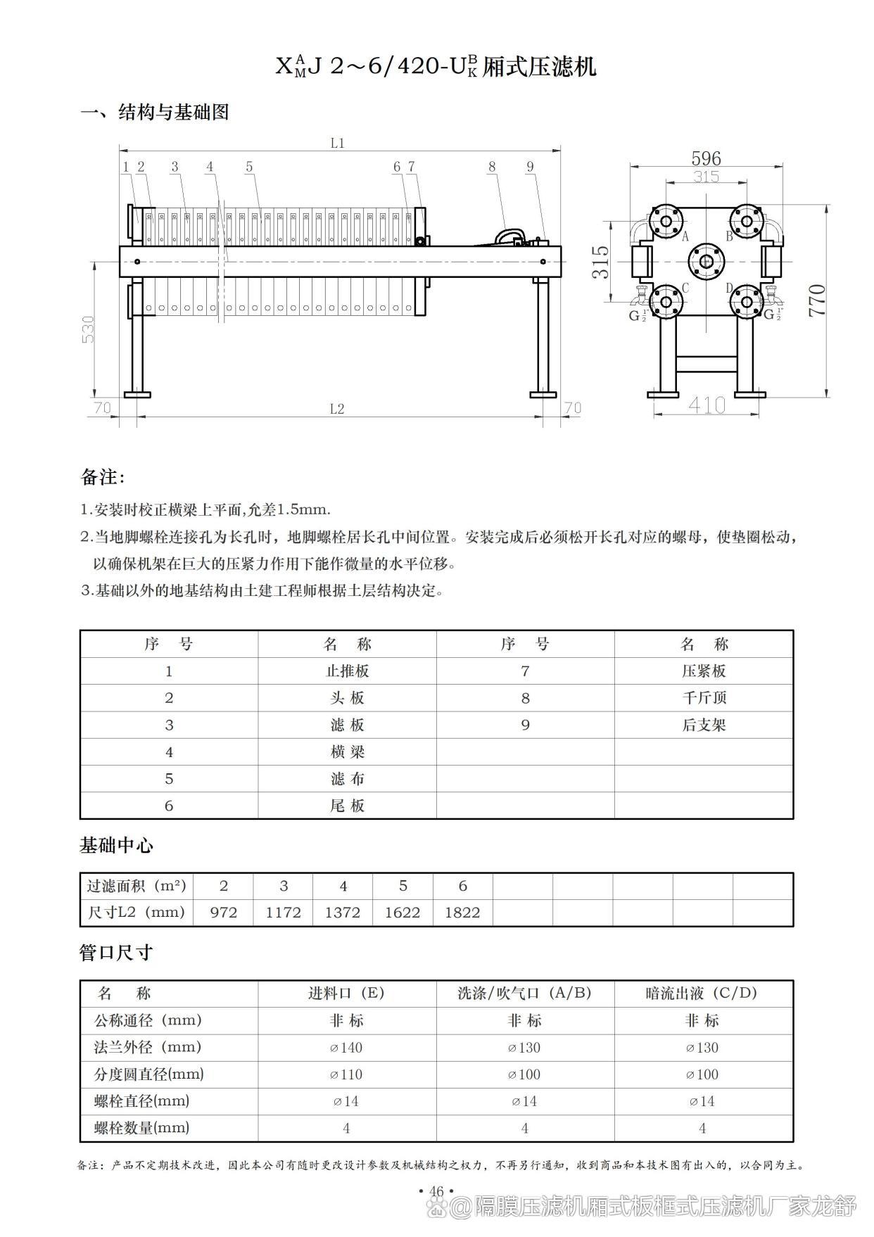 过滤面积 m2 | 滤板数量 (块) | 滤室 数量 (个) | 滤饼 厚度 mm | 滤室 容积 L | 外形尺寸 mm | 机器 质量 t | 进料管孔 直径 mm | 出液孔直径 | |||